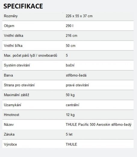Thule Pacific 500 je prostorný a funkční střešní box vybavený nejlepšími vlastnostmi. Rychloupínací systém Fast Grip uchycení boxu nesmírně usnadňuje, snížené dno pro menší odpor vzduchu a speciální patentovaná vzpěra Dual Force z otvírání a zavírání víka činí velmi jemnou operaci. V Thule Pacific 500 je možno převážet až 5 párů lyží a nebo 4 snowboardy (maximální vnitřní délka lyží je 216 cm). Střešní box Thule Pacific 500 v praktické šedé (šedá barva s povrchem víka "aeroskin" s antracitovým dnem). Thule Pacific 500 má vylepšený vzhled a novou strukturu materiálu víka „aeroskin“. Rozměry: d.221cm, v.37cm, š. 55cm, objem 290litrů. Maximální zátež 50kg.